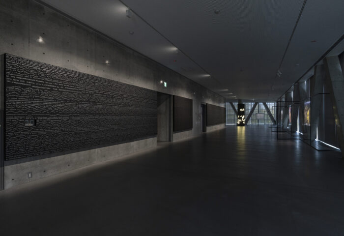 这一系列作品并不一定由宫岛达男亲手绘制,他人的参与为“生命共同体”的互联性提供了更广阔的视角。在创作过程中,宫岛达男提供随机排列的数字清单,再由参与者将其绘制出来。在本次特定场域装置中,三块黑色木板由三位来自台中亚洲大学的学生分别使用银色、铜色和金色的油性金属马克笔完成。