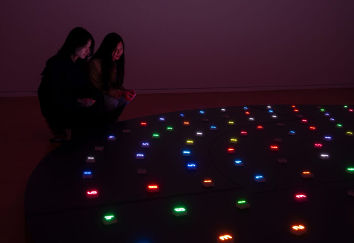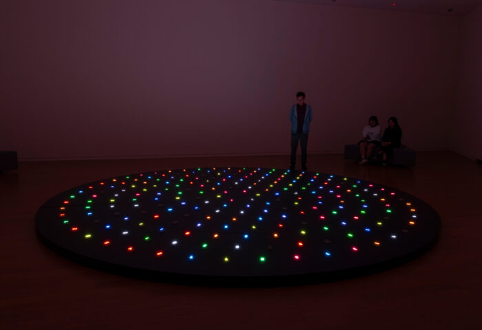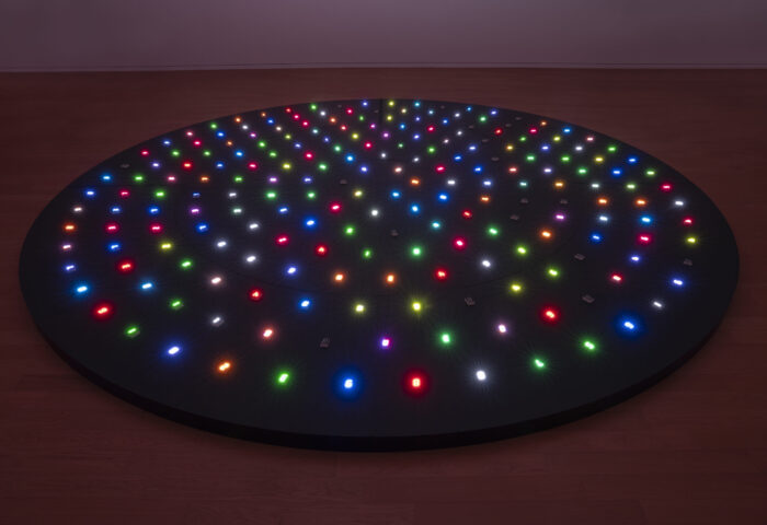 在这件作品中,这一百种状态通过十个数字——0到9和十种不同的颜色来表达,它们会随着时间的推移不断变化和转换。每个数字都象征着“生命”,而数字的缺失——空白——则代表着“死亡”或“空性”。这种生死轮回既表达了存在的短暂,也表达了存在的永恒韵律。