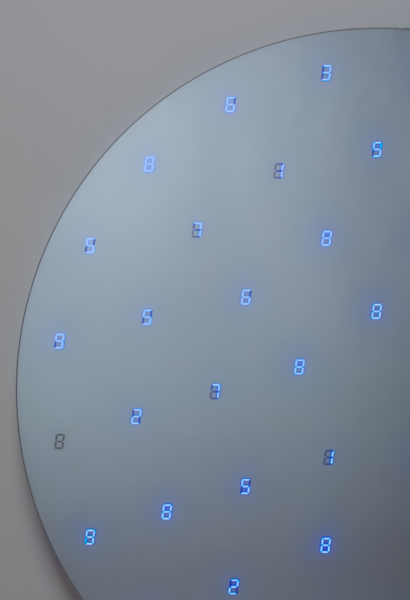 The circular mirror embedded with LEDs reflects not only the surrounding space but also the viewer's own image. The numbers within the mirror are LEDs counting down at different speeds. These LEDs count down from 9 to 1, never displaying 0, and then return to 9, repeating the cycle. The countdown from 9 to 1 represents "life," and the disappearance of 0 symbolizes "death." Together, these two—"life and death"—combine to represent "Seimei". According to Buddhist scriptures, "Seimei" spreads throughout the cosmos after 0 ("death"), filling the universe. In other words, the universe is overflowing with the invisible "Seimei."