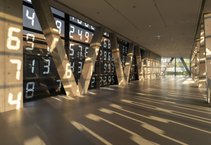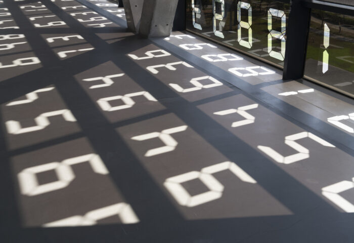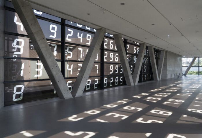 For this site-specific installation, the numbers displayed on each window were determined through a collaborative process of chance. These figures were randomly selected by students from Asia University and staff of the Museum of Modern Art.